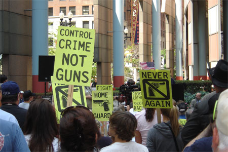 There were a number of attendees who held pro-gun signs. Some of the sign statements included, “Control Crime, Not Guns,” “Fight Crime, Shoot Back,” “Never Ban Guns Again,” and “Rape This [including a picture of an armed woman].”